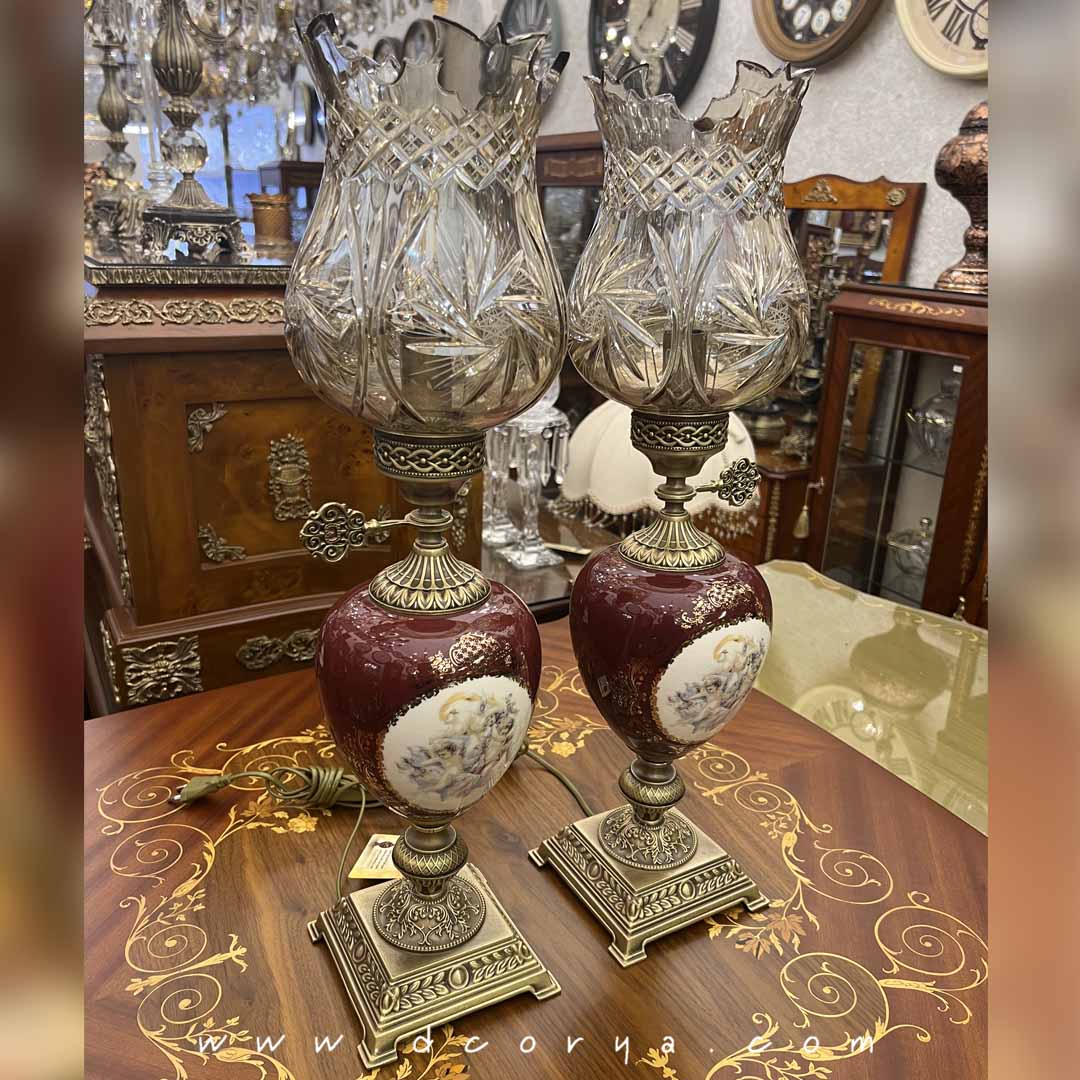 چراغ لاله چینی کریستال، پایه برنز با آبکاری آنتیک